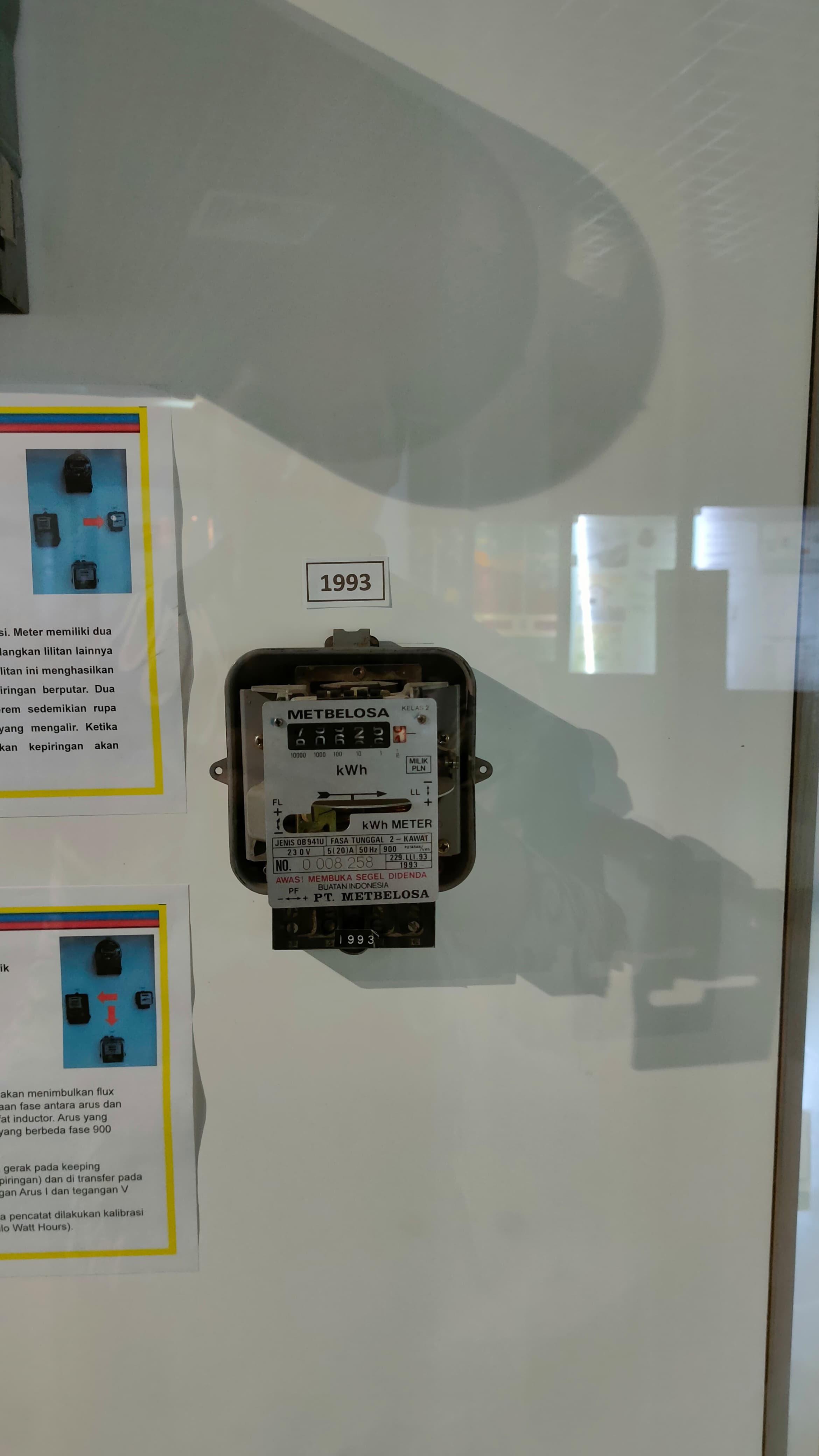KWH Meter 1 phase Metbelosa tahun 1993 adalah alat pengukur energi listrik yang dirancang untuk sistem listrik satu fasa, umumnya digunakan pada instalasi rumah tangga atau usaha kecil. Fungsi utamanya adalah untuk mencatat jumlah energi listrik yang dikonsumsi oleh pelanggan dalam satuan kilowatt-jam (kWh). Alat ini menjadi komponen vital dalam sistem distribusi tenaga listrik karena memberikan dasar perhitungan untuk penagihan biaya listrik berdasarkan konsumsi aktual.
